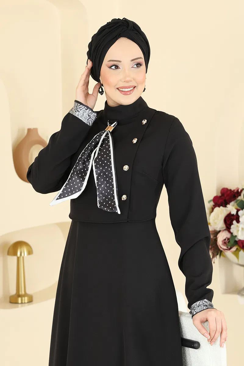 The Fular Accessorized Dabil Dress is a hijab fashion item suitable for all seasons. It can be gently washed at 30 degrees. Made from lightweight and breathable Dabil fabric, it stands out with its simple and elegant design. Featuring a semi-mandarin collar and back zipper, the dress offers functionality. It has an attached upper part and seamed waist, complete with a secret pocket detail. The scarf is detachable, allowing you to adjust it to fit your style.