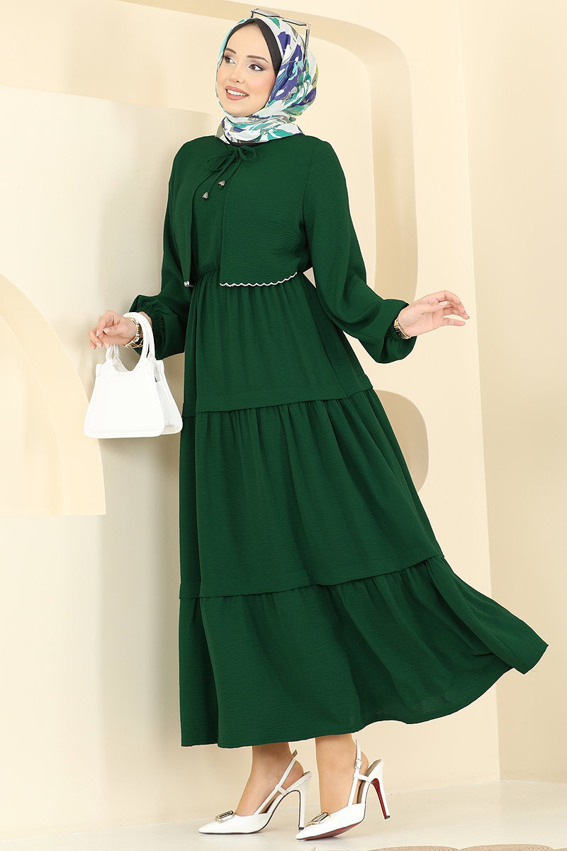 The Lace-Detailed Aerobin Dress combines modest wear with modern touches. Suitable for all seasons, this dress offers gentle wash at 30 degrees. Made from Aerobin fabric, it provides a lightweight and comfortable experience. The bike neck design adds elegance while the buttoned back allows practical use. Its unlined structure and elastic-cuffed sleeves offer freedom of movement. The necktie detail finishes the look with sophistication.