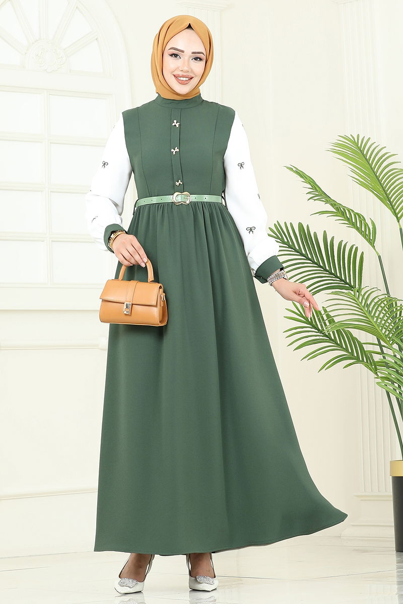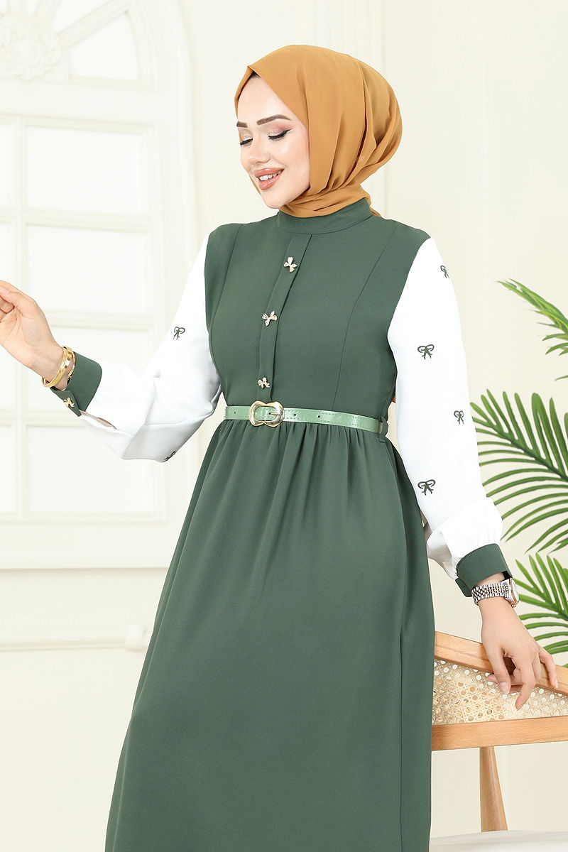 The Embroidered Crepe Dress is elegantly and modernly designed. Suitable for all-season use, this modest fashion piece is made from specially imported crepe fabric. It can be washed in a gentle cycle at 30 degrees Celsius. Featuring a semi-mandarin collar and a zipper at the back, it offers practical wearability. Embellished with embroidery details, the dress adds sophistication to your look. The belt, designed to shape the body, is adjustable for fit. The cuffs come with active buttons and it is unlined, ensuring light and comfortable wear.