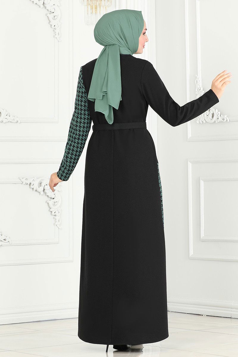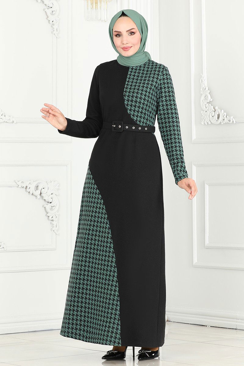 Herringbone Patterned Dress is a model of modest wear. It can be worn in the Autumn and Winter seasons. It should be washed at 30 degrees without wringing. It is made of first-class Tivit fabric. The dress has a bike collar and no lining. It has a back zipper. The two ends of the belt are stitched to prevent flapping, and the middle part is left empty (seamless). The belt is included with the product and is optional to use.