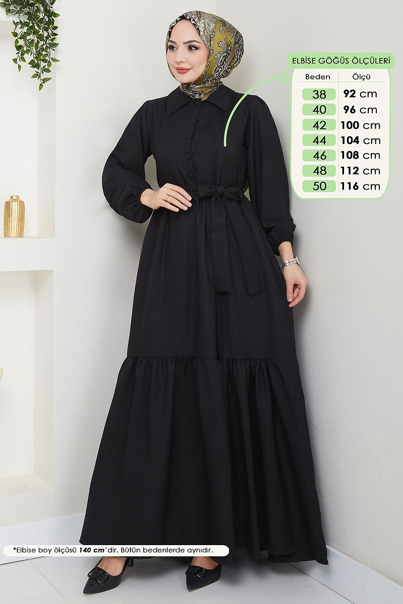 The Ruffled Hem Modest Dress is an elegant option suitable for all seasons. Made from Sofia linen fabric, this dress can be gently washed at 30 degrees. It features a shirt collar and a semi-buttoned front design that offers a modern and chic look. The dress is unlined, and the cuffs are elasticized. The belt detail is stitched at both ends with the center left unstitched and can be optionally used. Size-wise, the product on the model is a size 38.