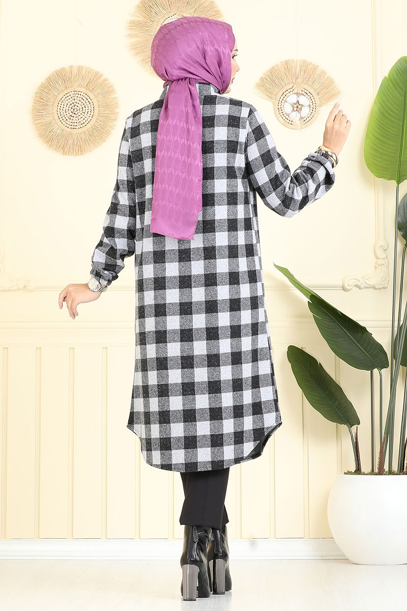 The Plaid Tunic with a Shirt Collar is an ideal modest wear tunic model for autumn and winter. Suitable for gentle wash at 30 degrees, this product is made from plaid fabric. It offers a stylish and practical use with a shirt collar design and front button detail. The tunic is unlined and features elasticated cuffs, with the product on the model being size 38.