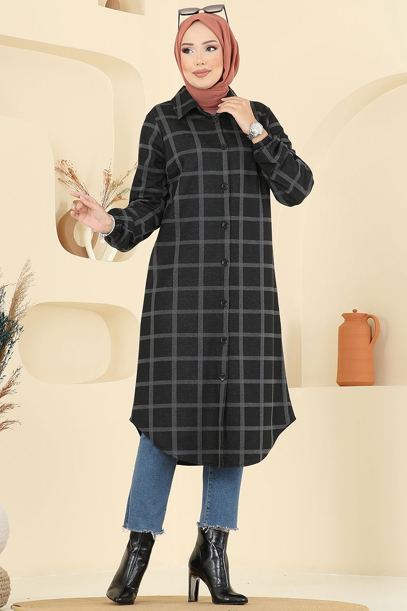 The Plaid Tunic with a Shirt Collar is an ideal modest wear tunic model for autumn and winter. Suitable for gentle wash at 30 degrees, this product is made from plaid fabric. It offers a stylish and practical use with a shirt collar design and front button detail. The tunic is unlined and features elasticated cuffs, with the product on the model being size 38.