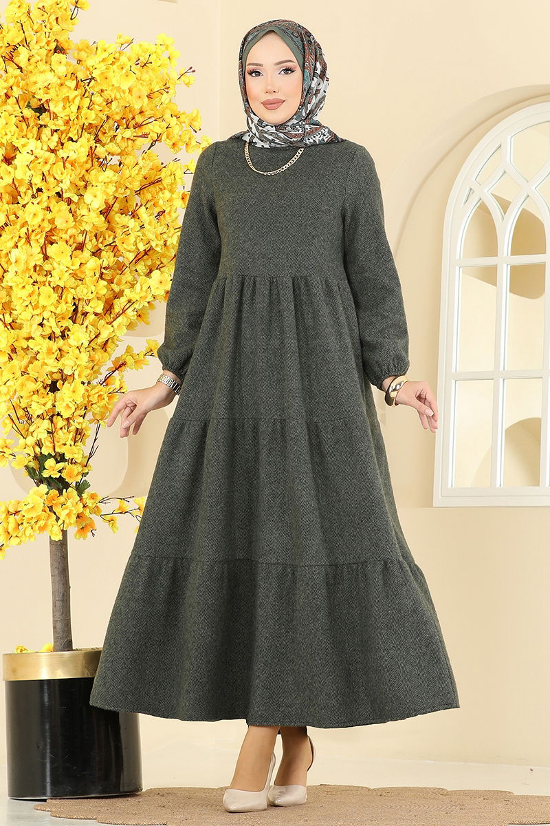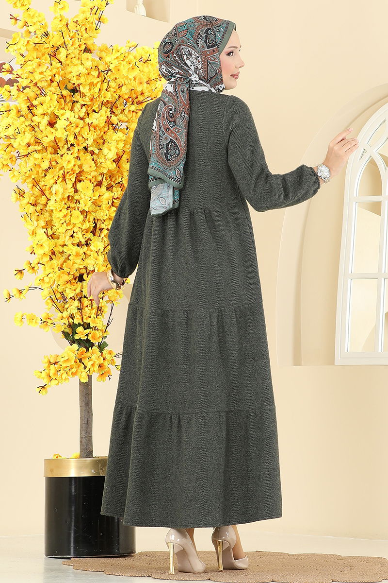 Elegant and chic, the Elastic Cuff Detailed Dress is an ideal choice for modest clothing. Suitable for use in Autumn and Winter, this dress is made from herringbone fabric and can be washed at 30 degrees on a gentle cycle. The crew neck and unlined design offer comfortable wear. Featuring an elastic cuff, this model is noteworthy for its button at the back and its over-the-head ease. The product displayed is in size 38 and does not show the inside.