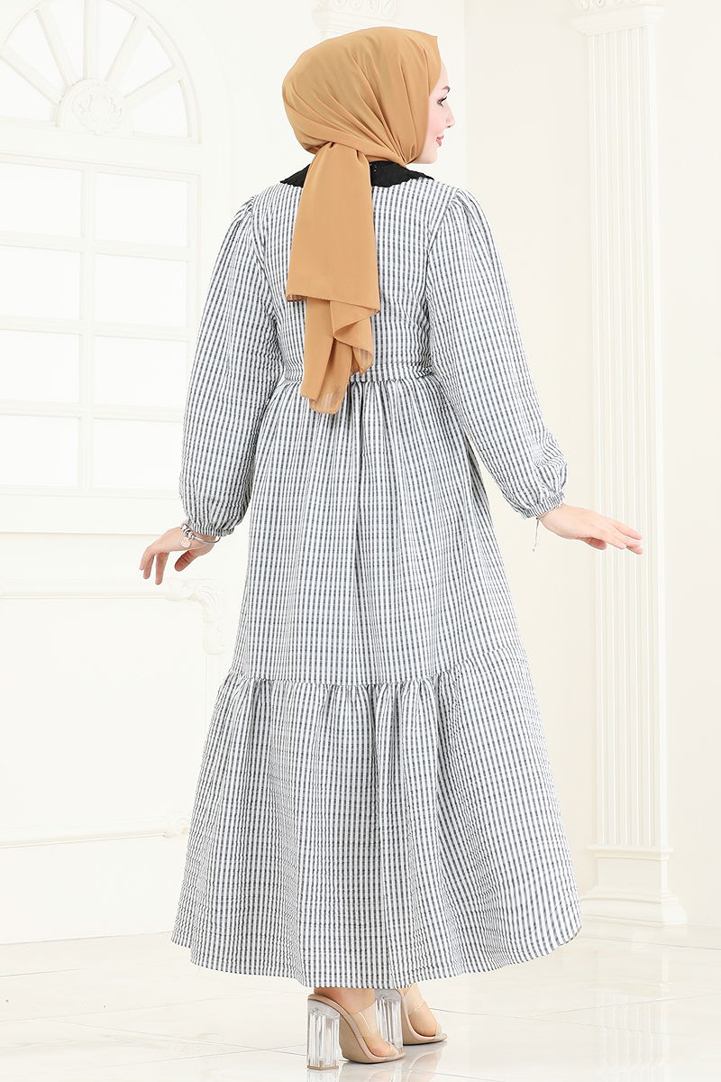 The Half-Buttoned Hijab Dress is an all-season model offering convenience. Made from crepe fabric, it can be washed gently at 30 degrees combining durability and comfort. Its collarless and lining-free design provides a light and elegant look. The front half-buttons and elastic cuffs add both practicality and aesthetic detail to the dress. Moreover, the specially sewn belt that prevents sagging adds a modern touch to the dress. The belt is removable, according to preference.