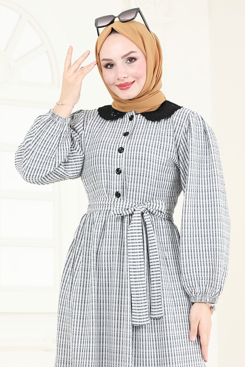 يوجد نصف أزرار متوفرة من الأمام. المنتج لديه ياقة بيبي. غير مبطنة. الحزام متضمن، ،يمكن استخدامها حسب الرغبة السوار مطاطي. قد يكون هناك اختلاف في الدرجة اللونية في المنتج بسبب التقاط الصور الفوتوغرافية.