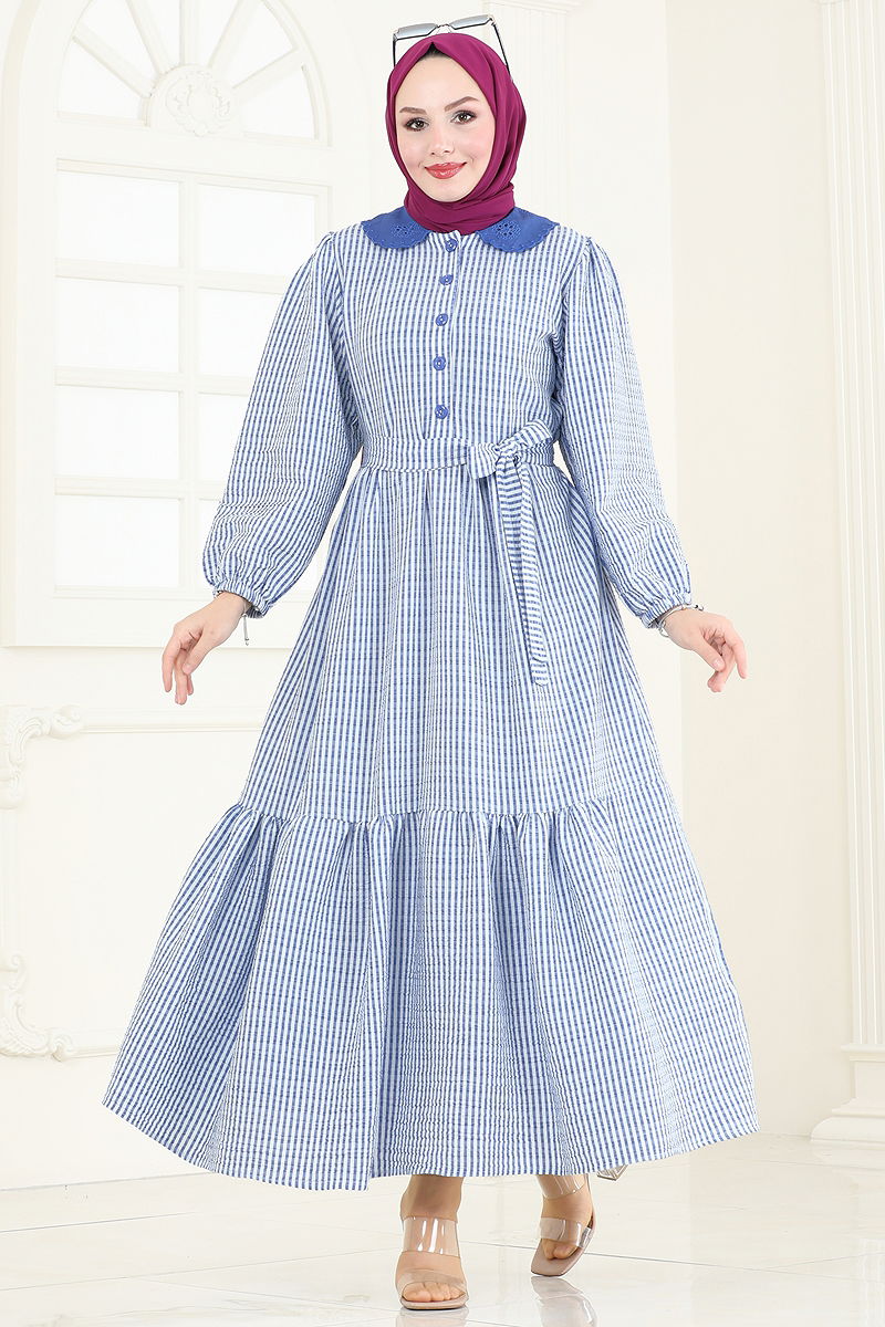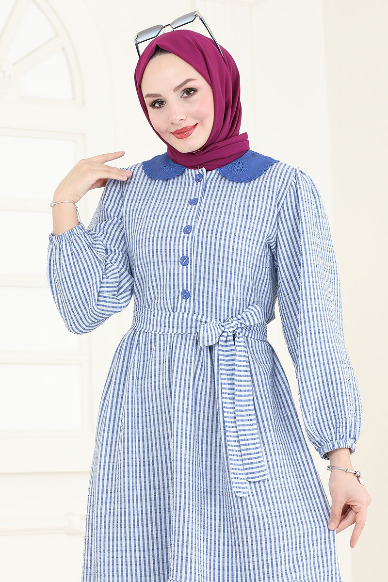 The Half-Buttoned Hijab Dress is an all-season model offering convenience. Made from crepe fabric, it can be washed gently at 30 degrees combining durability and comfort. Its collarless and lining-free design provides a light and elegant look. The front half-buttons and elastic cuffs add both practicality and aesthetic detail to the dress. Moreover, the specially sewn belt that prevents sagging adds a modern touch to the dress. The belt is removable, according to preference.