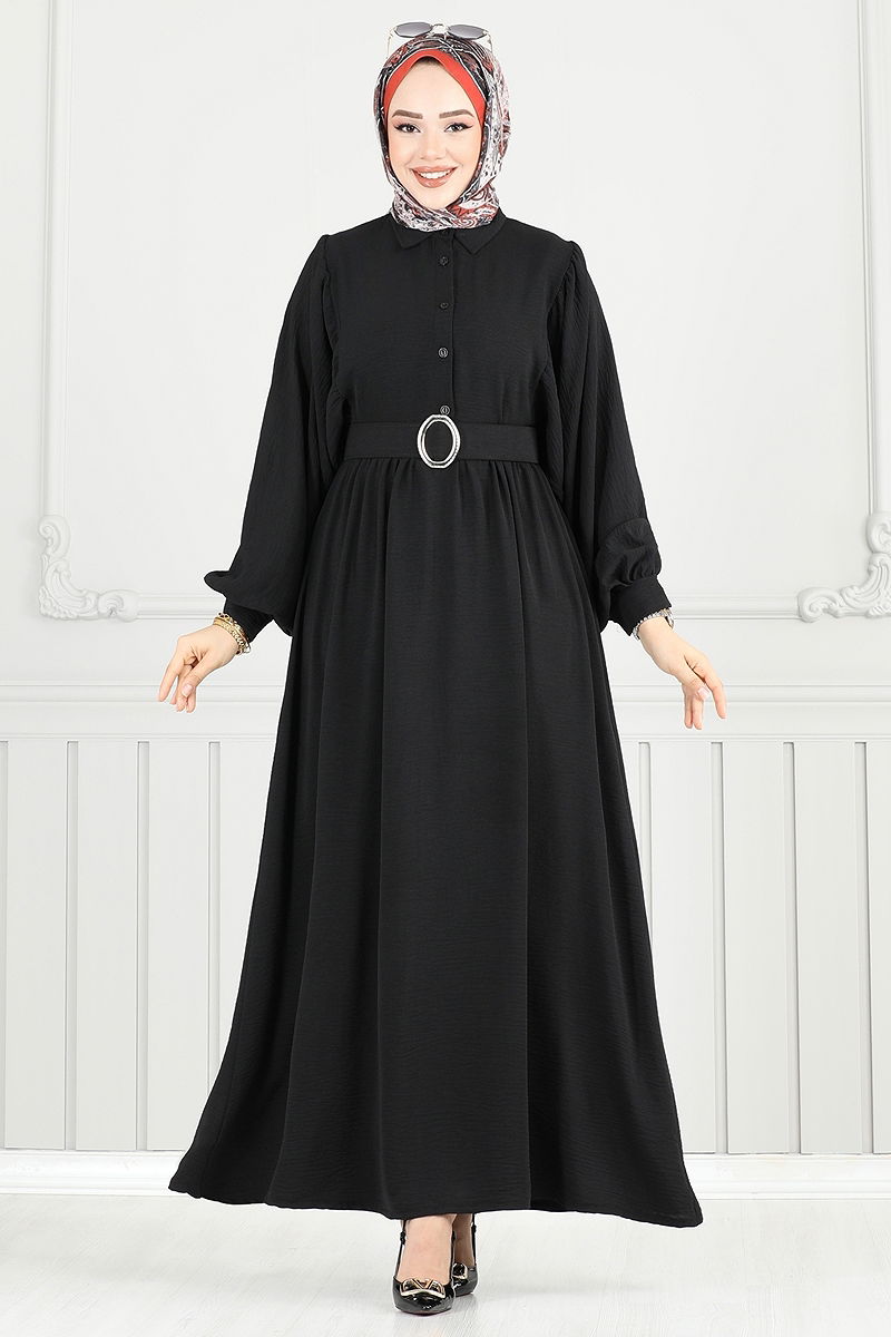 The Coated Belted Modest Dress offers an elegant choice that can be comfortably worn across all seasons. Its delicate aerobin fabric enhances comfort while being washable at 30 degrees without squeezing, facilitating easy maintenance. Featuring a shirt collar and half-button front design, it presents a trendy look. This unlined model comes in size 38 with functional cuff buttons. The belt is designed with stitched ends to prevent waving, left open in the middle, and can be optionally removed.