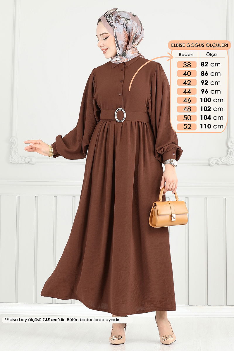 The Coated Belted Modest Dress offers an elegant choice that can be comfortably worn across all seasons. Its delicate aerobin fabric enhances comfort while being washable at 30 degrees without squeezing, facilitating easy maintenance. Featuring a shirt collar and half-button front design, it presents a trendy look. This unlined model comes in size 38 with functional cuff buttons. The belt is designed with stitched ends to prevent waving, left open in the middle, and can be optionally removed.