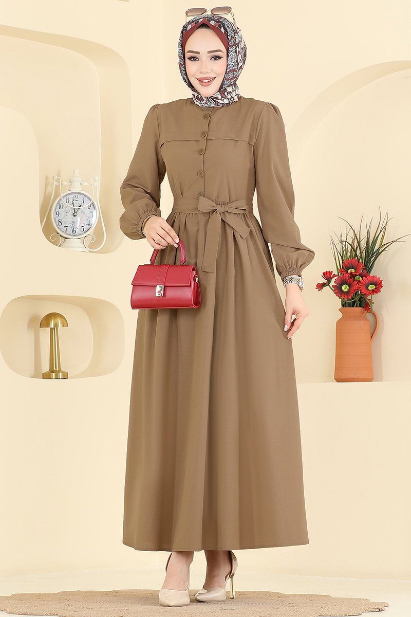 The Belted Terry Cotton Dress is a modest dress suitable for all seasons. It can be washed gently at 30 degrees Celsius, made from terrycotton fabric, and features a half stand-up collar design. It is front half-buttoned and unlined. The waist of the dress is stitched, and the belt is designed with stitched ends to prevent it from sagging, although it is optional and can be removed. With elasticated cuffs, this dress is both stylish and comfortable.