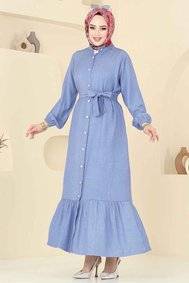 The Button-Front Tencel Denim Dress is a modest wear suitable for all seasons. This stylish dress can be delicately washed at 30 degrees and boasts a unique combination of tencel denim fabrics. It features a semi Mandarin collar and button-front design for easy wear. The dress is unlined with elastic cuffs and includes a belt, which is optional and can be removed. The belt ends are sewn to prevent waviness while keeping the middle part free of stitching. Its color and texture make it a versatile addition to any wardrobe.