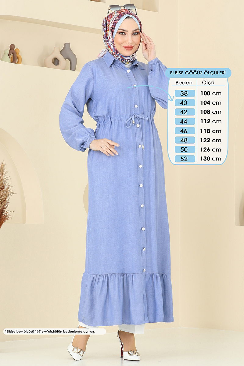 The Belted Tunnel Tencel Denim Dress is a modest wear piece that can be comfortably worn in any season. Designed with a unique combination of tencel denim fabric, this dress features an elegant shirt collar and front button design. It is recommended to wash it at 30 degrees on a gentle cycle. The unlined construction makes it light and practical. With a belted waist and elastic cuffs, this dress offers a stylish and comfortable clothing option. Model is wearing size 38: Height: 167 cm, Chest: 90 cm, Waist: 70 cm, Hip: 100 cm, Weight: 59 kg.