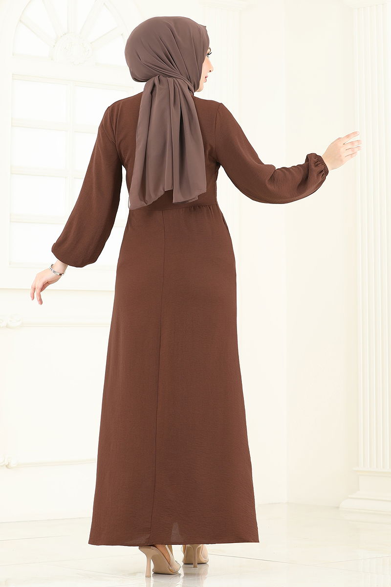 Featuring a modern and elegant design, this Side-Tie Gemstone Dress can be comfortably worn in all seasons. Made from aerobin fabric, this modest dress can be cleaned with a gentle wash at 30 degrees. With a crew neck and elasticated cuffs, this model is unlined and can be easily worn with a single button at the back. The gemstone details dazzle, while the side-tie waist design makes it uniquely attractive. Ideal for special occasions, this dress offers both elegance and comfort together.