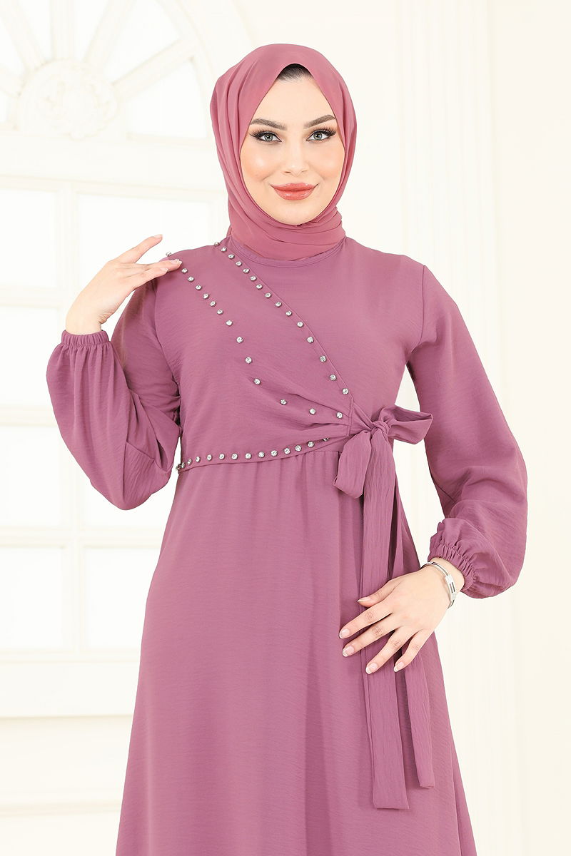 يوجد زر يمكن استخدامه من الخلف. يتميز بخصر ذو أربطة. المنتج لديه ياقة دائرية. غير مبطنة. التفاصيل الحجرية محفورة. يتم خياطة الحزام على المنتج. السوار مطاطي. قد يكون هناك اختلاف في الدرجة اللونية في المنتج بسبب التقاط الصور الفوتوغرافية.