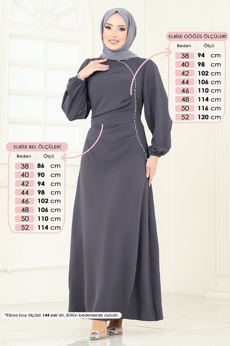Dazzle with the unique design and elegant pearl details of the Pearl Detailed Aerobin Dress, a modest garment suitable for all seasons. Made from aerobin fabric, this dress is lightweight and breathable, making it comfortable to wear all day long. Easily washable at 30 degrees with delicate care, it features a crew neck and elasticated cuffs for both style and practicality. With a zipper at the back and a sewn-in belt, this model offers a modern silhouette, while the pearl embellishments enhance its elegance.