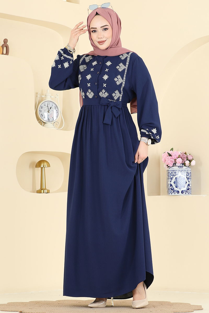 This Embroidered Crepe Dress is an ideal hijab dress that can be used throughout all four seasons with its elegant design. Washable at 30 degrees without squeezing, this product is made from imported crepe fabric. Featuring a shirt collar and a half-buttoned front opening, the dress is unlined and showcases detailed embroidery. The waist is meticulously stitched and the cuffs are elasticized, offering the option to create different styles with its belt. The belt is designed with both ends sewn leaving the middle part open and can be optionally removed.