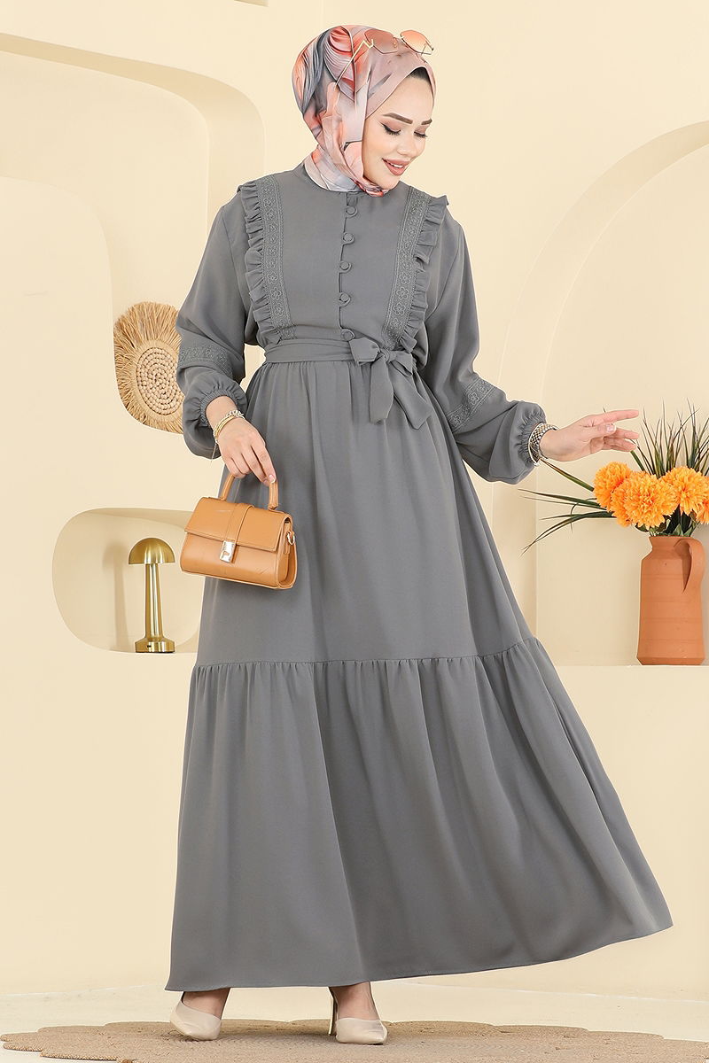 The Ruffle Detailed Crepe Dress is a modest wear model that can be comfortably used in all four seasons. Its delicate nature allows for washing at 30 degrees. Featuring a semi-mandarin collar and half-button front, this dress offers both style and convenience. It is unlined, with a seamed waist and elasticated cuffs. The size 42 on the model ensures a flattering fit for all sizes.