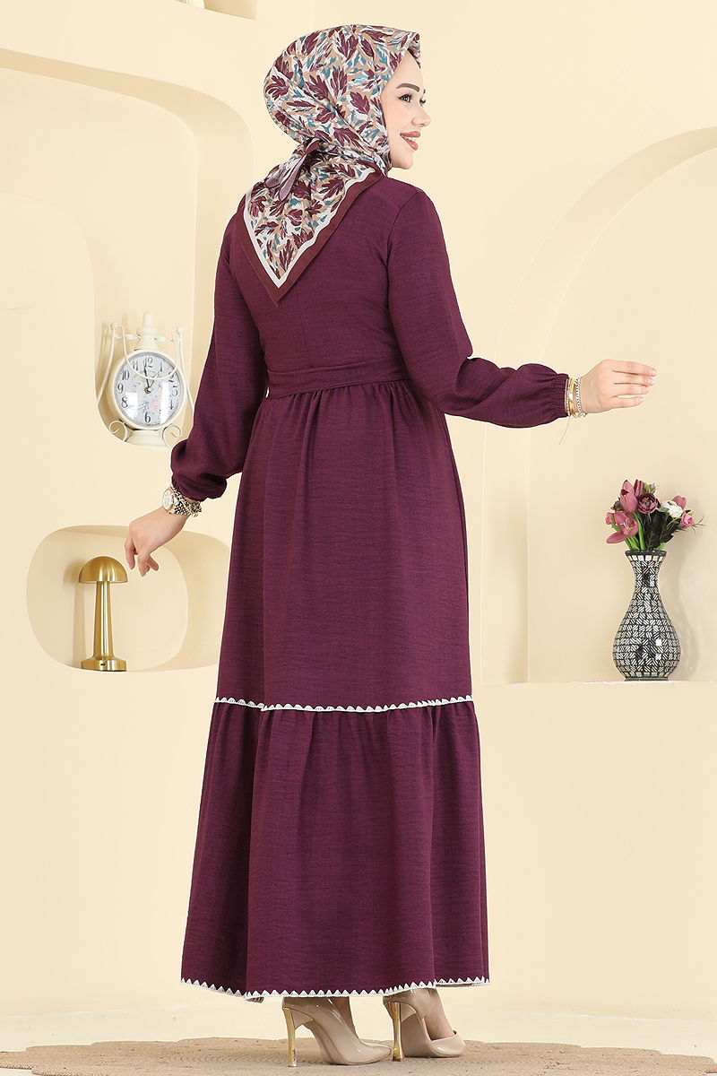 The Embroidered Sofia Dress is a hijab-friendly model that can be comfortably worn in all four seasons. Recommended to be washed gently at 30 degrees without wringing. Made from linen fabric, this elegant dress features a crew neck and is unlined. Its back button detail enhances usability. The waist of the dress is stitched, adorned with embroidery details. The belt adds elegance while its ends are stitched and the middle part is left unstitched to prevent waviness. The belt can be optionally removed. With elastic cuffs, this dress is both comfortable and stylish.
