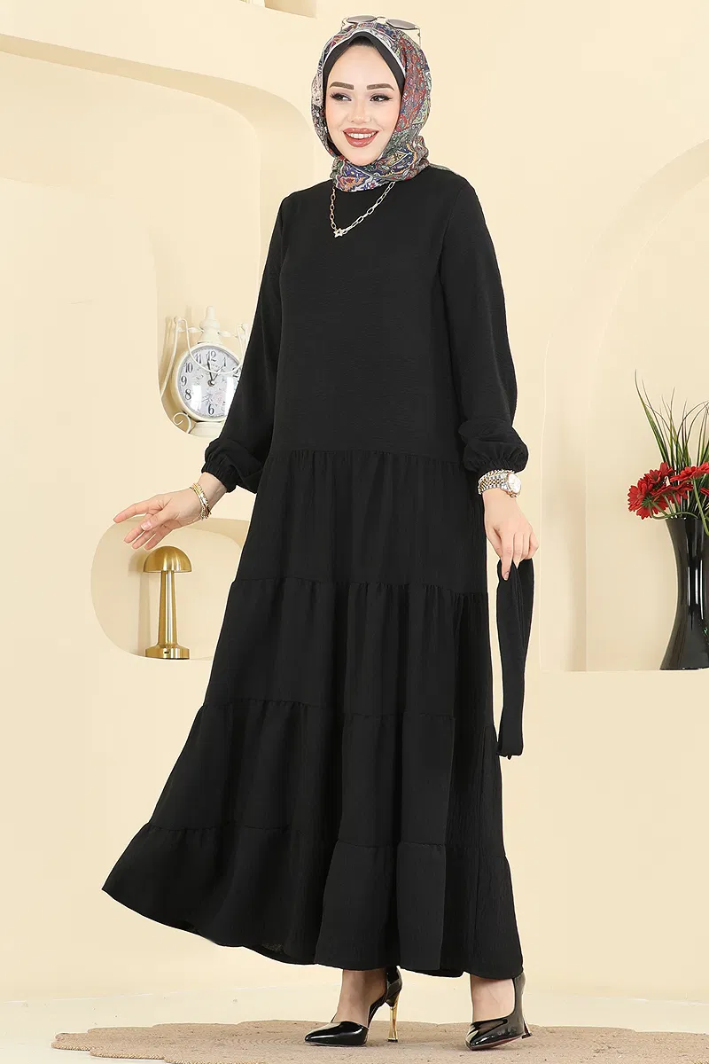 The Layered Skirt Aerobin Dress is an ideal choice for those looking for chic and modern modest fashion, suitable for all seasons. Made from Aerobin fabric, this dress features a bike neck and elasticated cuffs, and is unlined. This dress, which can keep your elegance in all seasons, can be washed delicately at 30 degrees. The belt included with the product offers comfortable use and can be removed if desired. Additionally, a practical button at the back ensures easy wear.