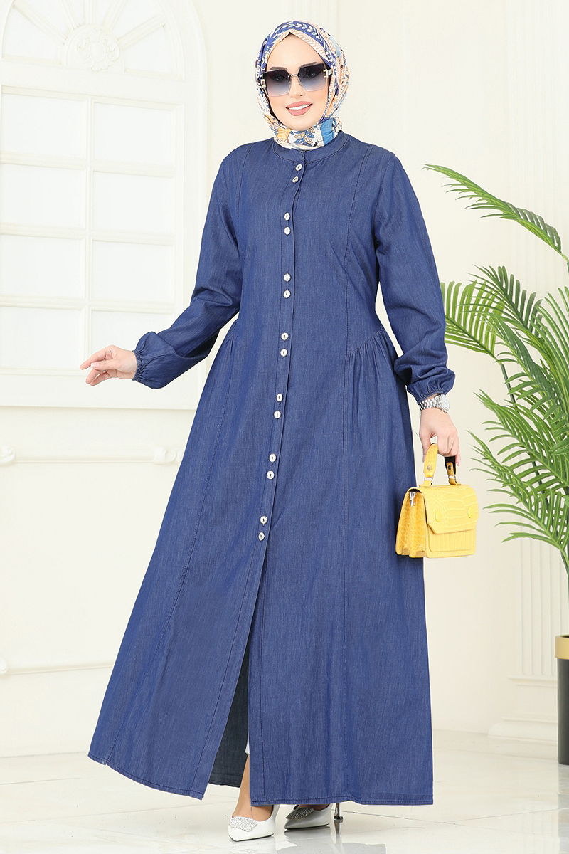 The Front Buttoned Dress Abaya is designed to maintain your elegance throughout all seasons. It offers a comfortable and functional design with a bicycle collar and front-buttoned structure for practical use. The side-tied and sewn belt adapts to different body sizes. Made from denim fabric, this dress is washed at 30 degrees on a gentle cycle. Its unlined structure makes it light and comfortable. The elastic cuffs promise an easy dressing experience. This abaya model deserves a place in your wardrobe as a stylish piece of modest clothing.