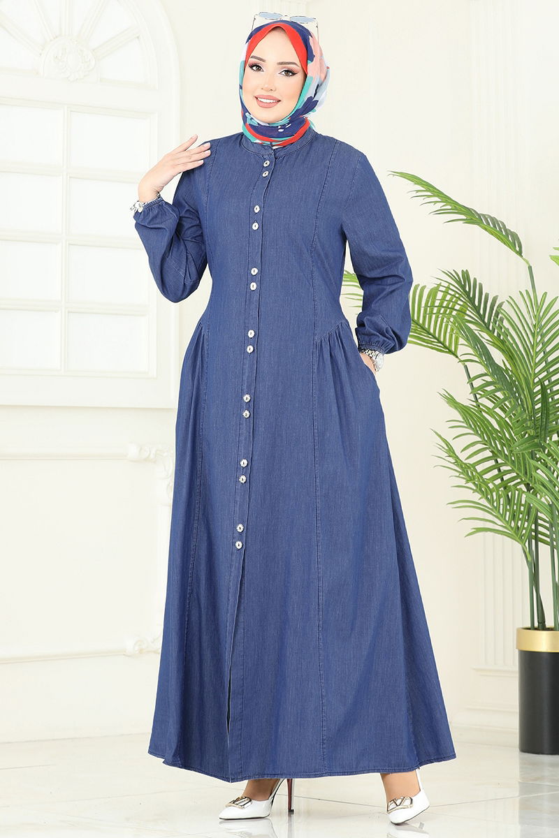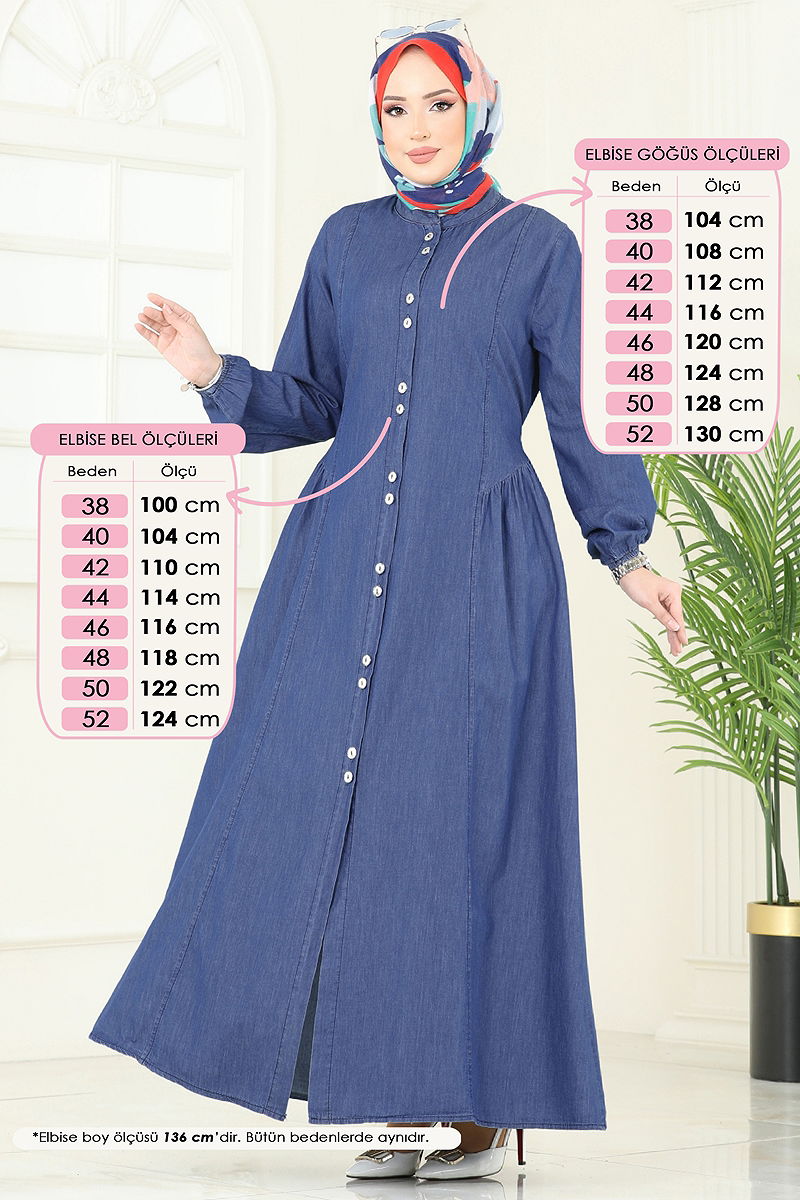 The Front Buttoned Dress Abaya is designed to maintain your elegance throughout all seasons. It offers a comfortable and functional design with a bicycle collar and front-buttoned structure for practical use. The side-tied and sewn belt adapts to different body sizes. Made from denim fabric, this dress is washed at 30 degrees on a gentle cycle. Its unlined structure makes it light and comfortable. The elastic cuffs promise an easy dressing experience. This abaya model deserves a place in your wardrobe as a stylish piece of modest clothing.