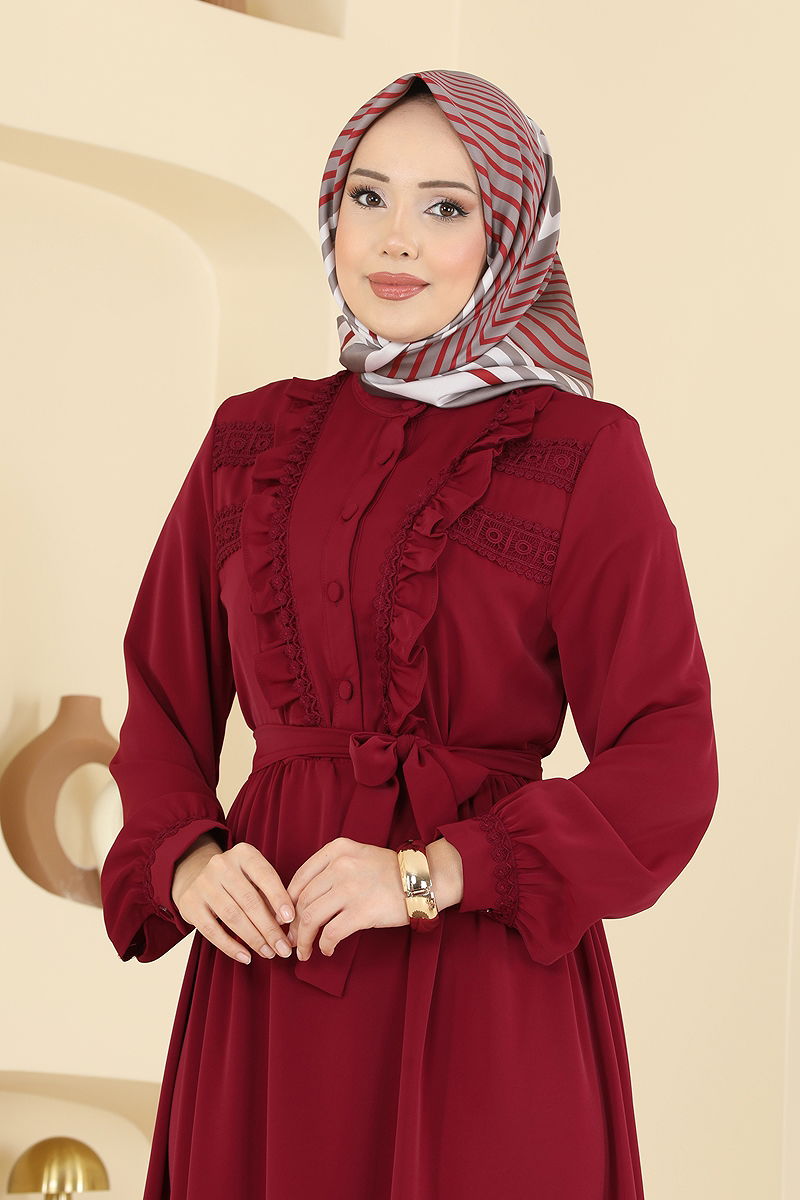 Elevate your elegance with this Lace Detailed Dubai Silk Dress, suitable for all seasons. This dress can be washed at 30 degrees with a delicate wash setting thanks to its delicate wash feature. Made from Dubai silk, it features a semi-mandarin collar and has a front half-button design for practical use. The dress is unlined and has a seamed waist. Active cuff buttons add functionality. The dress displayed on the model is size 38.