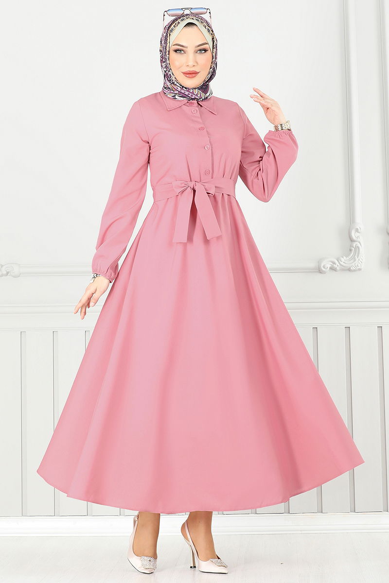 The Half-Buttoned Terrycotton Dress is a modest apparel suitable for all seasons. It can be washed gently at 30 degrees and is made from terrycotton fabric. Featuring a shirt collar and half-button front, this unlined dress comes with a belt, where the ends are stitched and the middle is left seamless. The belt is optional. The cuffs are elasticated, offering both comfort and elegance in one piece.