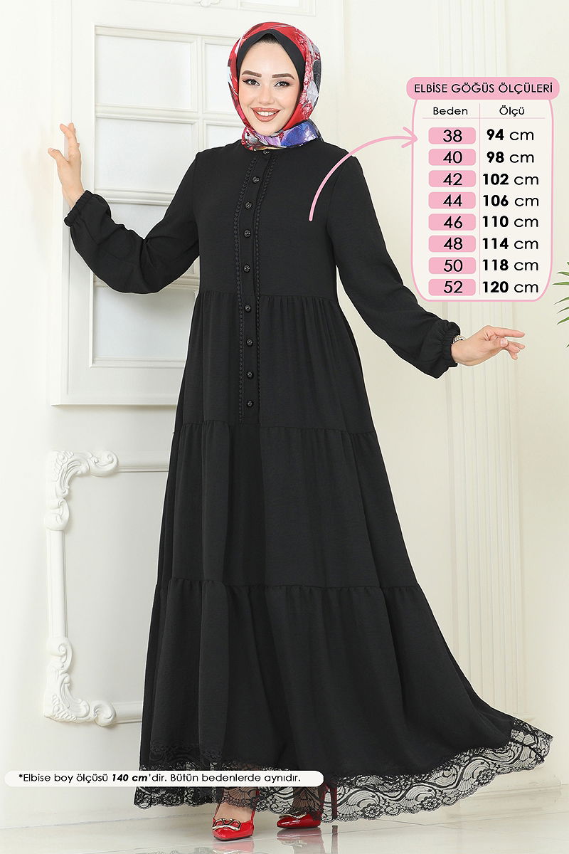 The Aerobin Dress with lace details combines elegance and comfort in modest wear. Suitable for all seasons, this dress is made from breathable Aerobin fabric. It can be gently washed at 30 degrees. Featuring a half-mandarin collar and half-button front design, it offers practicality and style. The elasticated cuffs and unlined structure of the dress ensure comfort throughout the day.