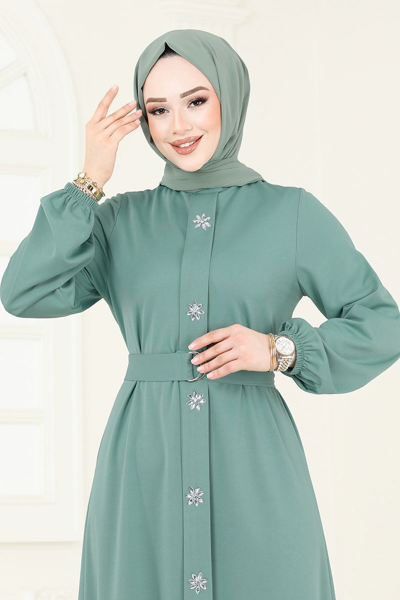 This elegant Stone Front Hijab Dress can be comfortably worn in any season. Washable at 30 degrees with a gentle cycle, this dress is made from high-quality Mira fabric. It features a bike neck and a lining-free design that offers a contemporary look. The dress's Stone details are adhesive and the belt detail adds elegance. The belt is sewn at both ends with an unstitched middle and can be optionally removed. With elastic cuffs, this dress is pulled over the head and will definitely turn heads.