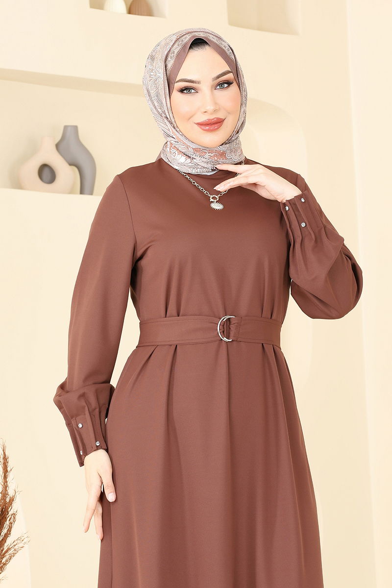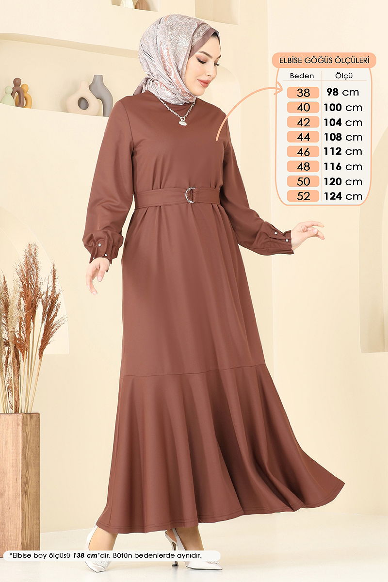 The Gem-Studded Sleeve Hijab Dress is a versatile piece suitable for all seasons. Made from Dabil fabric, this dress features a bicycle neckline and a liner-free design for comfort. It can be washed at 30 degrees with delicate care. The dress attracts attention with its gem-studded sleeves and a button at the back that makes it easy to wear. The belt is designed to prevent waviness, with the option to wear it as you like. The product displayed is in size 38.