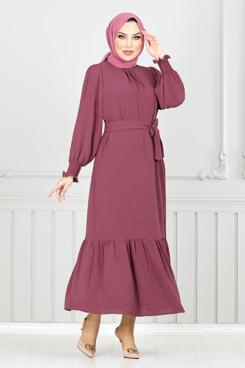 The Elastic Cuff Aerobin Dress is a modest wear piece suitable for all seasons. Designed for gentle washing at 30 degrees, this dress is made from breathable aerobin fabric. Featuring a high collar and a zipper at the back, it offers a modern and stylish look. Its lining-free construction makes it lightweight and comfortable. The elastic cuffs ensure a snug fit, enhancing wearability. The belt is designed with stitched ends to prevent wavering and can be optionally removed, providing a harmonious addition to the dress.