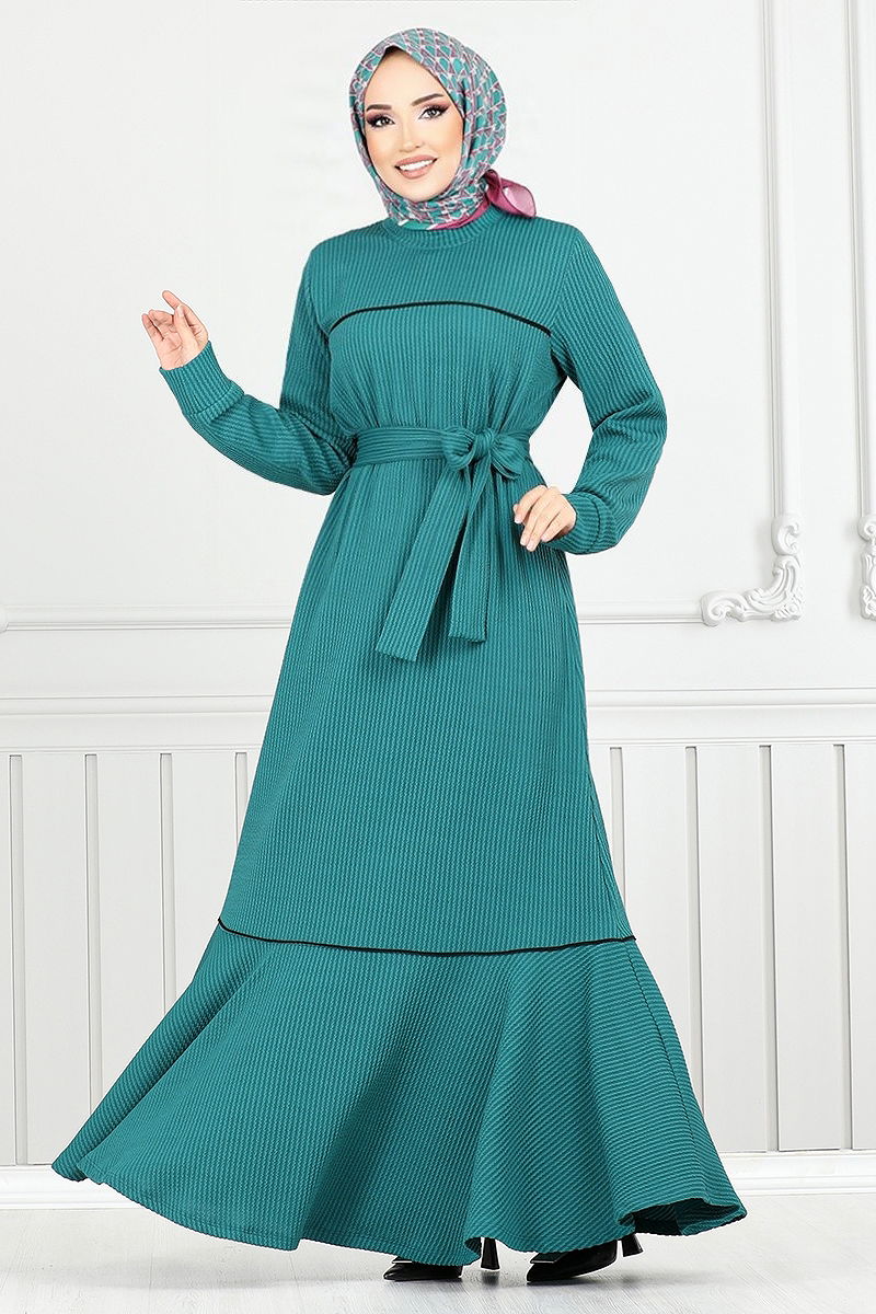 This Ribbed Winter Dress with Piping Detail is a modest, seasonal wear for autumn and winter. It should be delicately washed at 30 degrees. Manufactured from ribbed knit fabric, it features a crew neck, is unlined, and comes with a stylish belt that has fixed ends to prevent waving, though it is optional. The dress offers a chic appearance for any winter wardrobe.