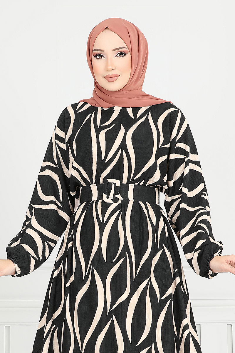 Elastic Cuffed Patterned Dress is a model of dress suitable for hijab clothing. It can be washed at 30 degrees without squeezing. It is made of square fabric. The product has a bicycle collar. It is unlined. (The product on the model is standard size.) The ends of the belt have been sewn to prevent it from fluttering, and the middle part is left empty (seamless). The belt is included with the product and may be optionally used. The sleeves are elastic cuffed.