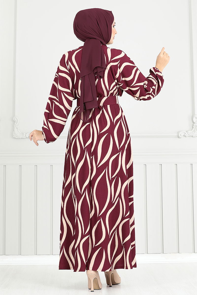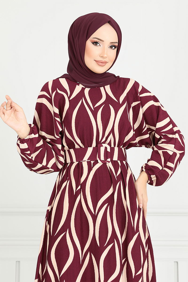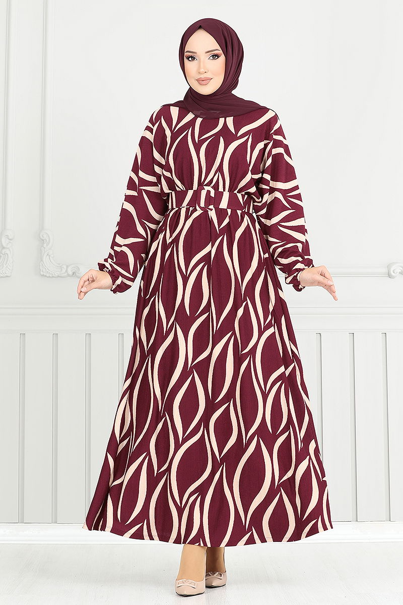 Elastic Cuffed Patterned Dress is a model of dress suitable for hijab clothing. It can be washed at 30 degrees without squeezing. It is made of square fabric. The product has a bicycle collar. It is unlined. (The product on the model is standard size.) The ends of the belt have been sewn to prevent it from fluttering, and the middle part is left empty (seamless). The belt is included with the product and may be optionally used. The sleeves are elastic cuffed.