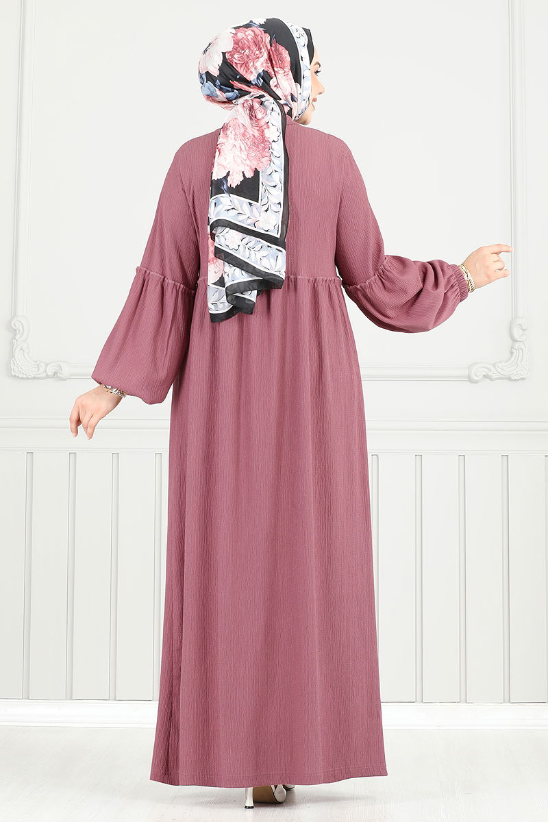 Experience both comfort and elegance in all seasons with the 'Front Buttoned Hijab Dress'! This dress, which can be washed at 30 degrees with its delicate structure, offers long-lasting use thanks to its bürümcük fabric. The semi-standing collar and front-button design provide a modern look, while the elastic cuffs complete the design. The unlined structure provides light and comfortable wear, and its belted seam design perfectly fits your body contours.