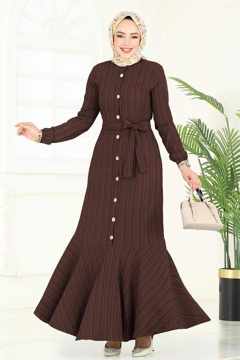 Featuring a front-buttoned design, this modest dress offers year-round comfort with a modern twist. Suitable for gentle wash at 30 degrees, it is made from durable crinkle fabric. The stand collar and elastic cuff details add elegance, while its lining-free structure provides light and comfortable wear. Coming with a specially designed belt with stitched ends, this model allows optional use of the belt. The front-buttoned feature makes it easy to wear while ensuring a fashionable look.
