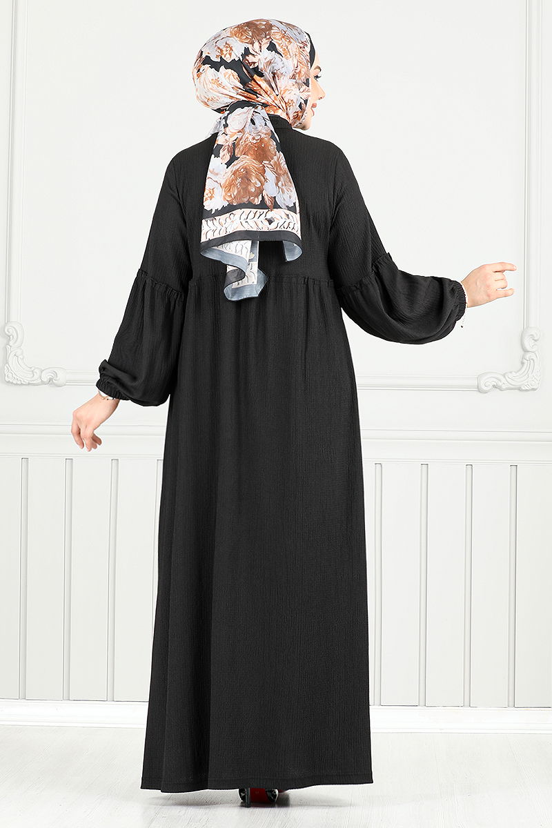 The Buttoned Front Crimp Dress is a hijab-friendly model that can be comfortably worn in all seasons. This product, which requires gentle washing, can be washed at 30 degrees and maintains elegance with its special crimp fabric. It offers a modern look with a semi-mandarin collar and front button details. Its lining-free design and stitched waist detail increase comfort, while the elasticated cuffs make it easy to wear. The model is size 38.