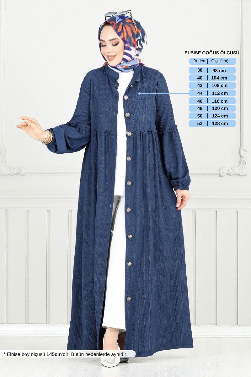 The Buttoned Front Crimp Dress is a hijab-friendly model that can be comfortably worn in all seasons. This product, which requires gentle washing, can be washed at 30 degrees and maintains elegance with its special crimp fabric. It offers a modern look with a semi-mandarin collar and front button details. Its lining-free design and stitched waist detail increase comfort, while the elasticated cuffs make it easy to wear. The model is size 38.