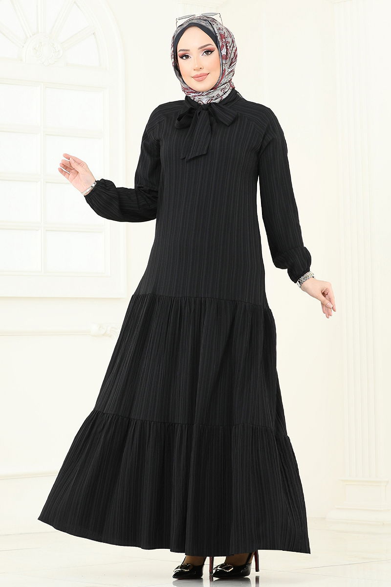 Scarf Collar Hijab Dress. This elegant and chic hijab dress can be comfortably worn in all seasons. It is washable at 30 degrees on a gentle cycle. Made from tree bark fabric, this model features a scarf collar and is non-lined. The cuffs are elastic, offering both functionality and style. The product shown on the model is size 38.