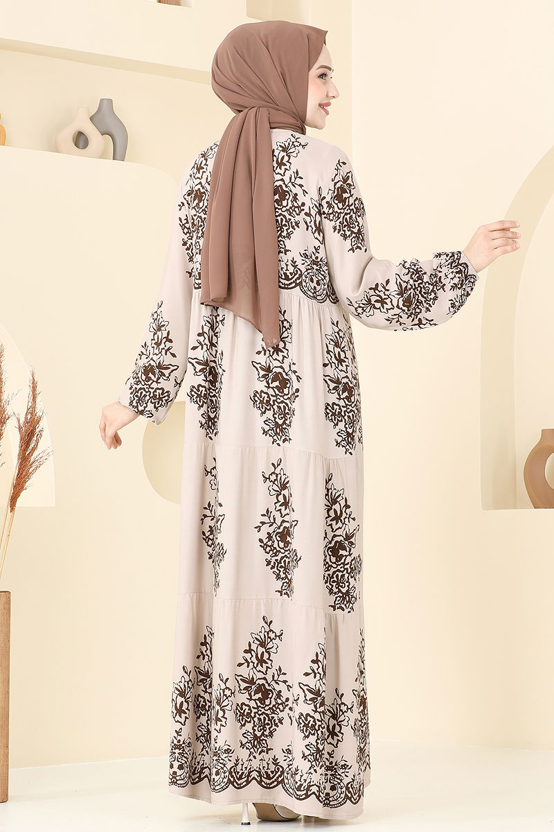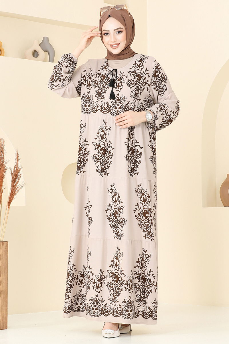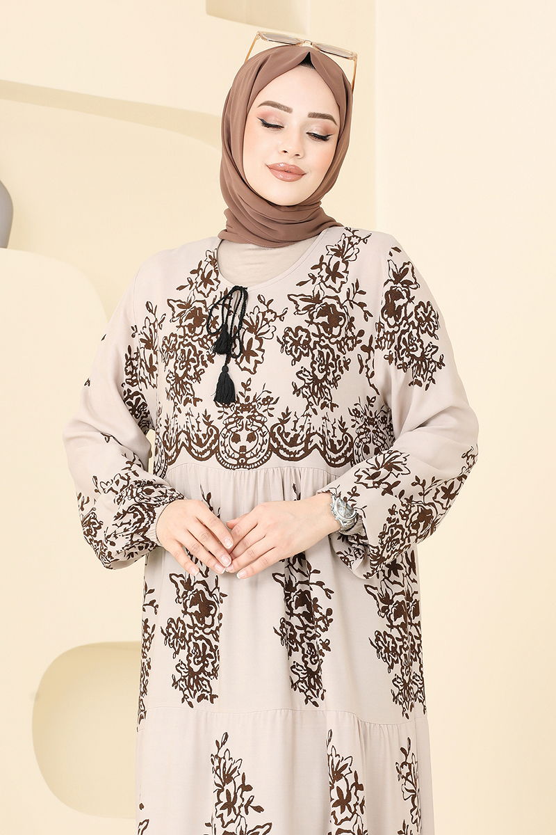 The Ethnic Pattern Hijab Dress is a year-round versatile piece made from viscose fabric. Its bike neck and unlined design add modern flair, while hand washing is recommended. Chic and practical, the dress features drawstring details and elasticated cuffs! (The product shown on the model is size 38.)