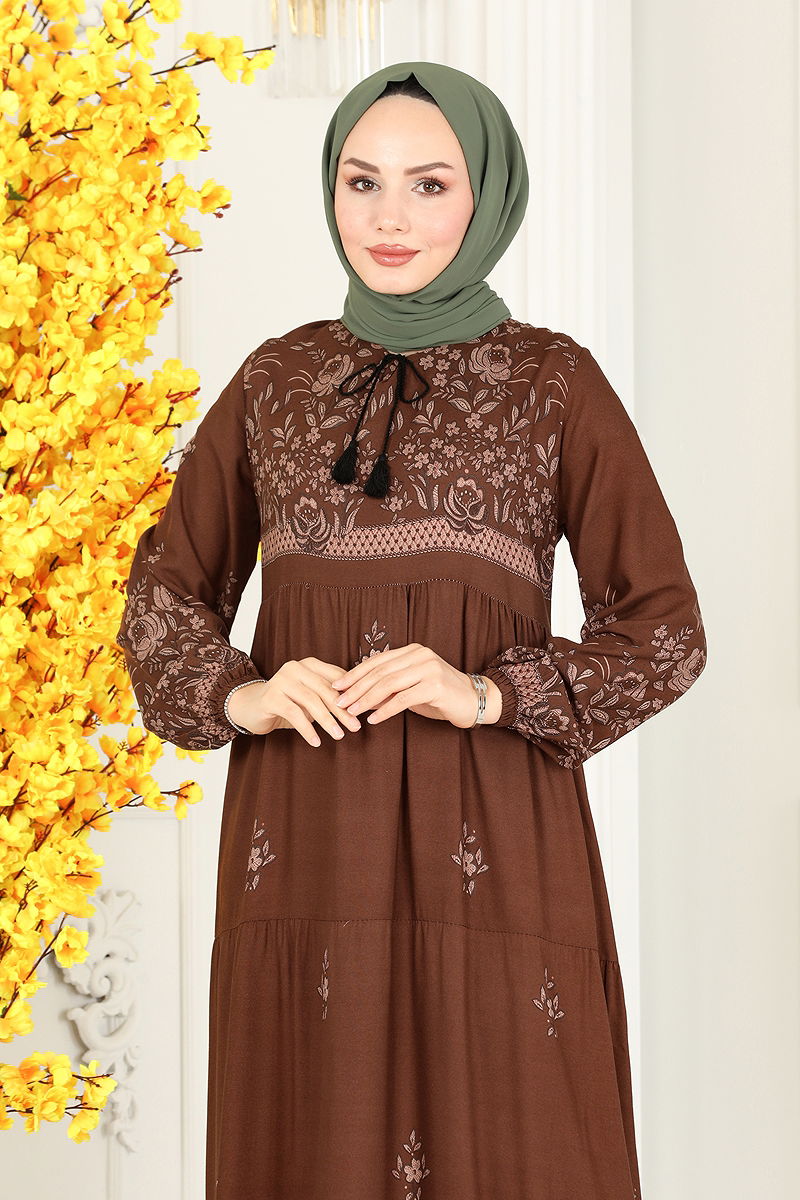 Lace-up Collar Patterned Viscose Dress is a modest fashion item. It can be worn in the Spring and Summer seasons. Hand wash is recommended. It is made Viscose fabric. The product has a V collar and is unlined. (The product on the model is size 38.) Height: 160 cm, Chest: 82 cm, Waist: 68 cm, Hips: 96 cm, Weight: 53 kg. The cuffs are elastic.