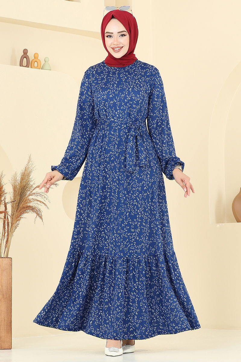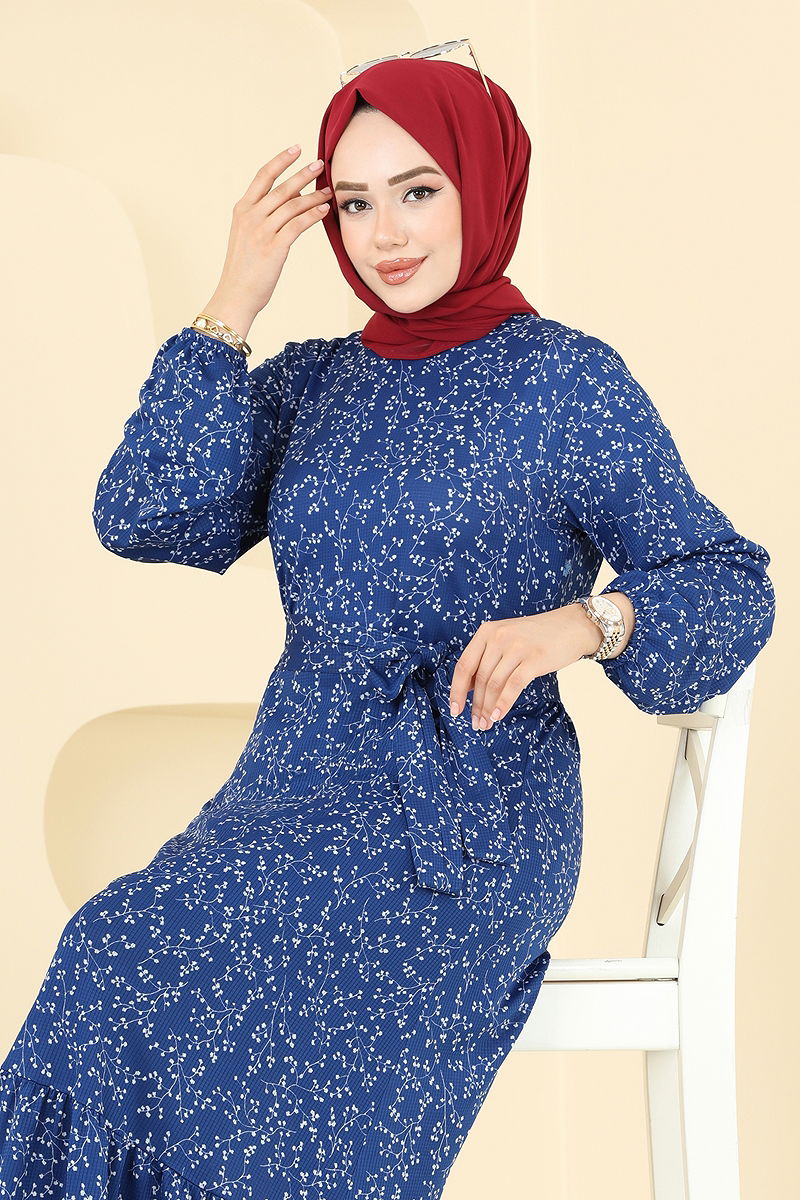 The Chain Patterned Dress is specifically designed for modest fashion and can be comfortably worn in all seasons. It can be washed on a delicate cycle at 30 degrees Celsius, offering practicality. This dress is made from Helen fabric and features a crew neck design. It is unlined and easy to wear over the head. The belt designed to match the dress is sewn at both ends with the middle left unstitched to prevent waviness. The belt is detachable if desired. The cuffs are elasticated, and the model wears size 38.