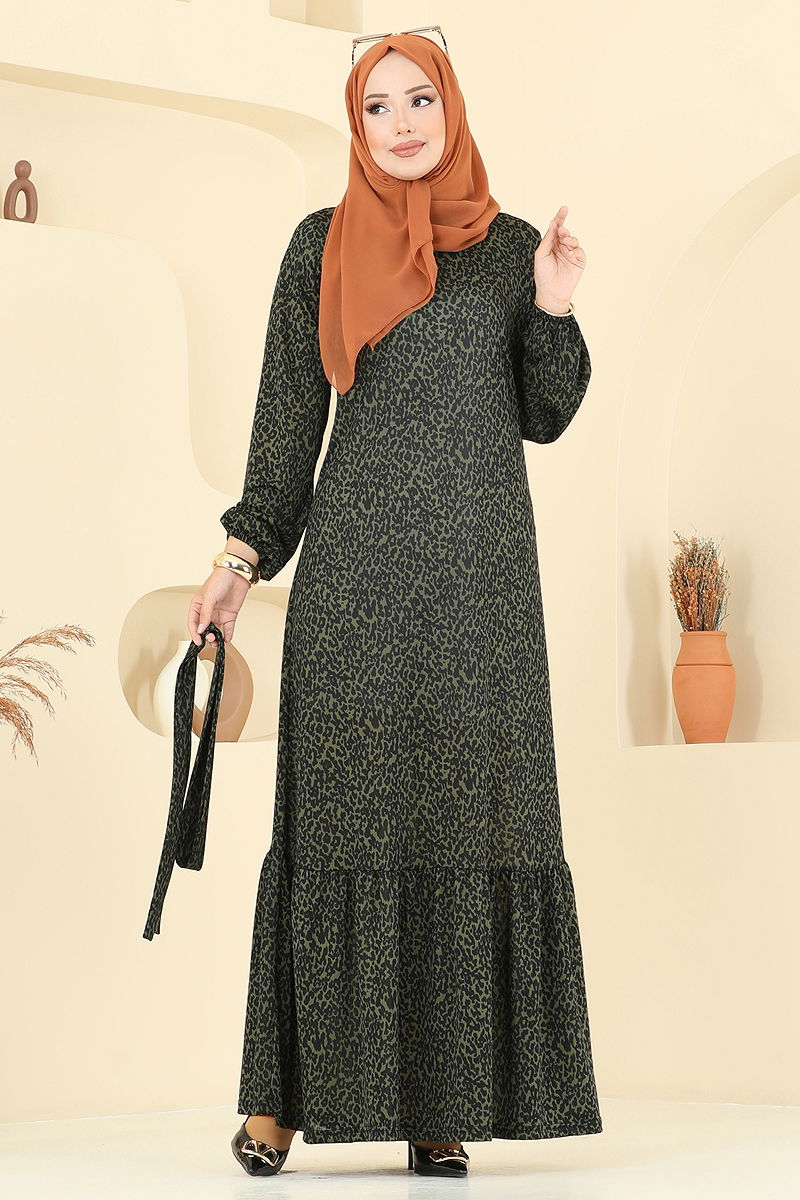 The Chain Patterned Dress is specifically designed for modest fashion and can be comfortably worn in all seasons. It can be washed on a delicate cycle at 30 degrees Celsius, offering practicality. This dress is made from Helen fabric and features a crew neck design. It is unlined and easy to wear over the head. The belt designed to match the dress is sewn at both ends with the middle left unstitched to prevent waviness. The belt is detachable if desired. The cuffs are elasticated, and the model wears size 38.