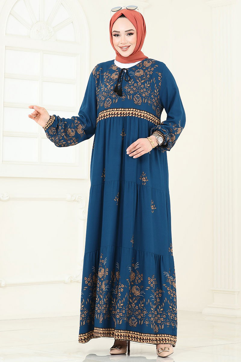 The Floral Pattern Viscose Dress is an elegant and chic option for any season, perfect as a modest wear. Made from viscose fabric, it offers a light and comfortable fit. Washable at 30 degrees on a gentle cycle, this dress features a v-neckline and stitched tie details at the neck, ensuring a feminine style. With elasticated cuffs, it provides freedom of movement while maintaining your elegance all day long.