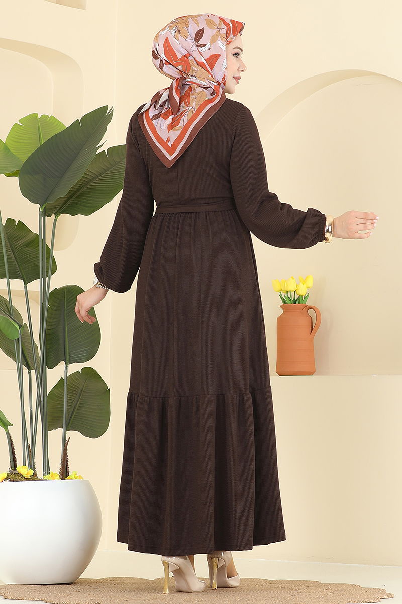 The Tiered Belted Dress is a distinctive hijab fashion item, made from twist fabric which makes it suitable for all seasons. It can be gently washed at 30 degrees and features a crew neck design. The dress, which is cuff-elastic and unlined, has a seamed waist. The belt is designed with both ends sewn, leaving the middle part unsewn, included with the dress and can be optionally omitted.