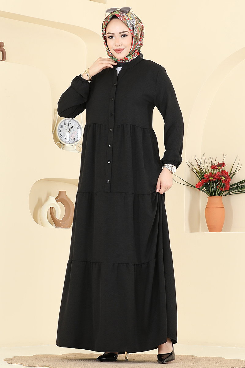 Buttoned Aerobin Long Dress is a stylish and modern modest wear. Suitable for all seasons, this dress can be washed at 30 degrees on a gentle cycle. Made from aerobin fabric, it promises long-lasting wear. Features a semi-mandarin collar and button-front design for practicality. The dress is unlined and has elasticated cuffs. Models are displayed in size 40.
