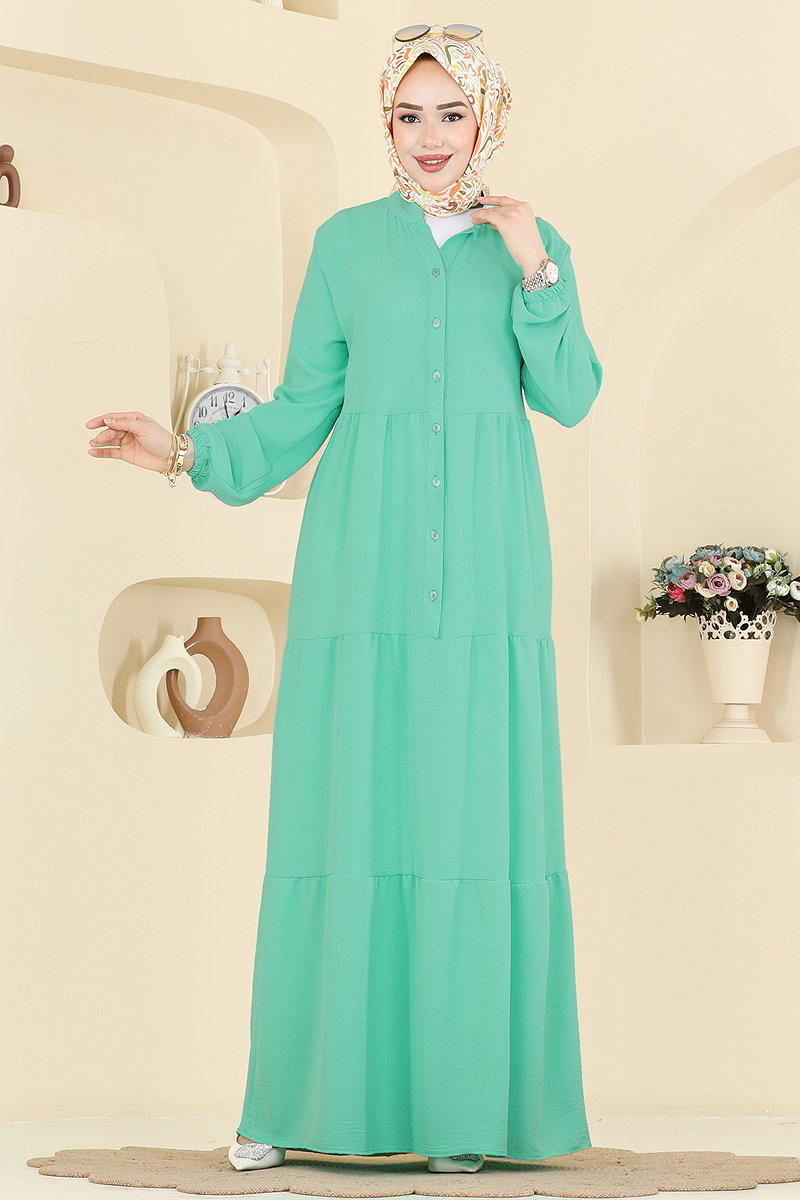 Buttoned Aerobin Long Dress is a stylish and modern modest wear. Suitable for all seasons, this dress can be washed at 30 degrees on a gentle cycle. Made from aerobin fabric, it promises long-lasting wear. Features a semi-mandarin collar and button-front design for practicality. The dress is unlined and has elasticated cuffs. Models are displayed in size 40.