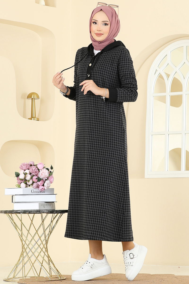 The Houndstooth Patterned Modest Dress offers an elegant and chic look that will keep you warm during the autumn and winter months. It can be washed at 30 degrees due to its delicate fabric. The hooded collar adds a modern touch, while the half-button front design makes it practical to use. The unlined and opaque structure ensures comfortable wear. Suitable for both everyday and special occasions, this dress gains functionality with pockets on the sides.