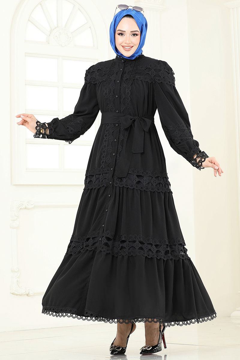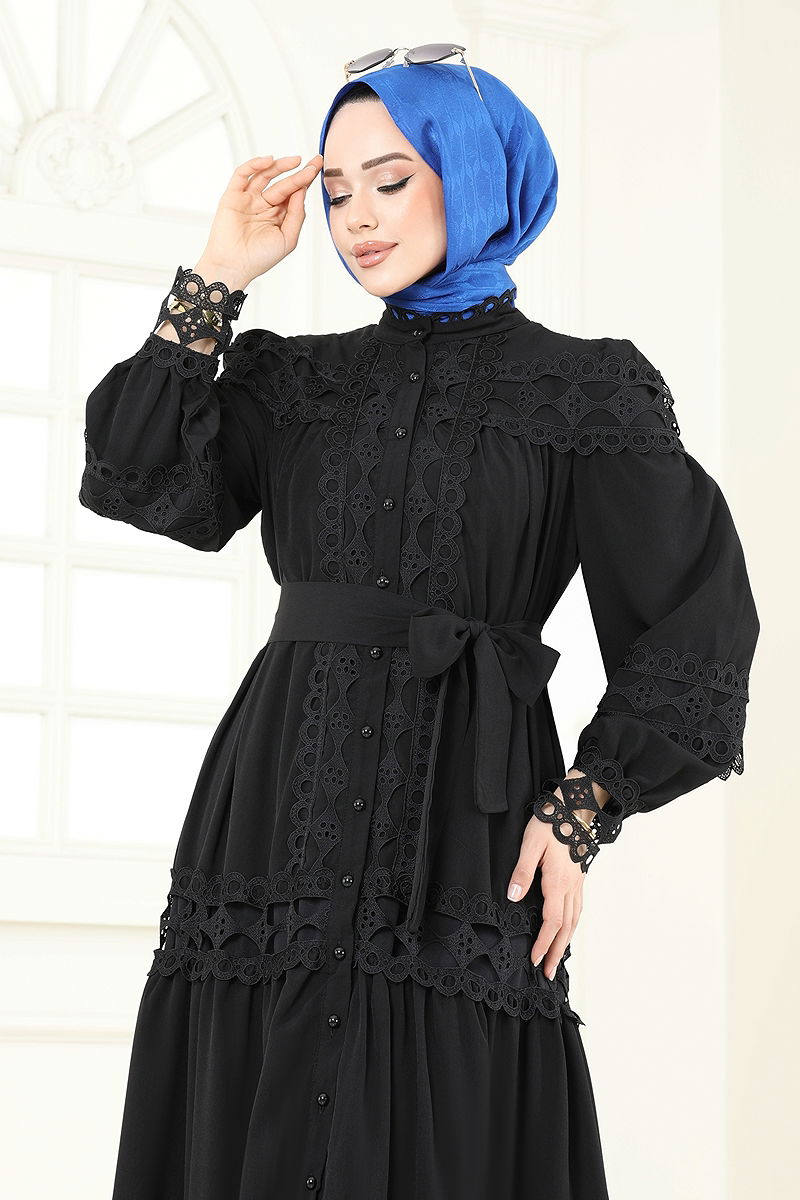 The SUAL Lace Detail Dress offers comfort and elegance throughout all seasons. Suitable for gentle wash at 30 degrees, this modesty dress is made from crepe fabric and is lined. Its stand-up collar design, elastic cuffs, and a customizable belt at the waist ensure a perfect fit. The belt is specially sewn at the ends to prevent waviness, adding a graceful touch to your style. (The product shown is in size 38.)