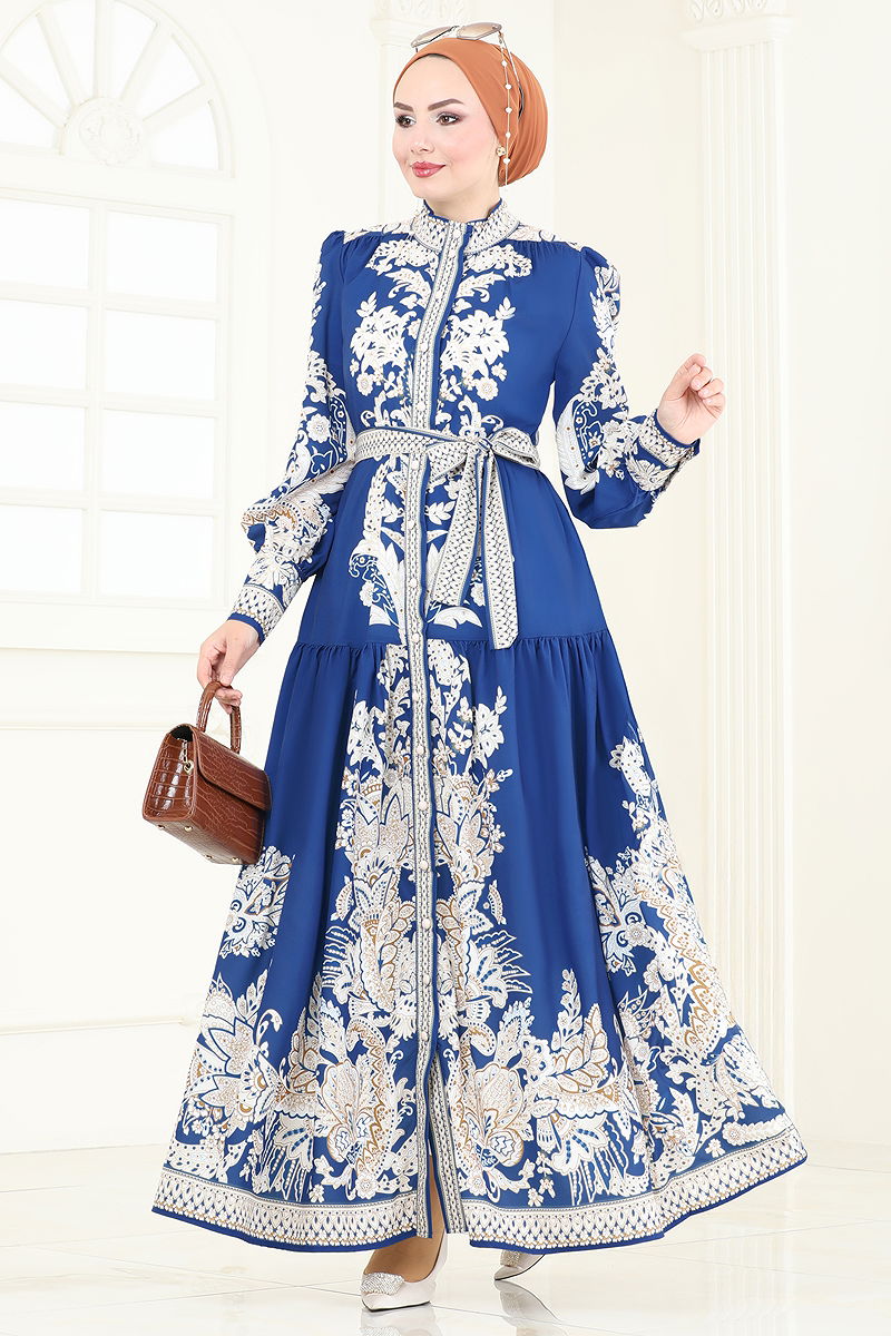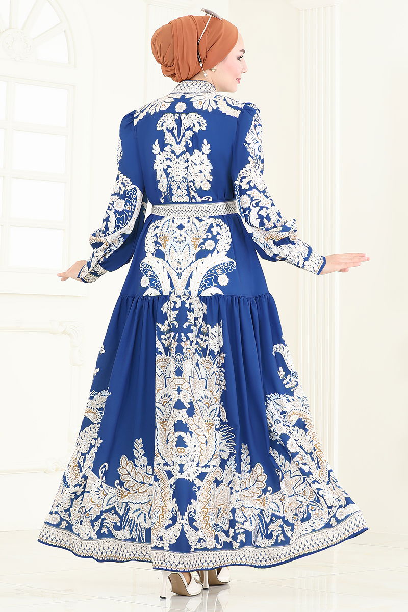The Belted Patterned Dress is a modest wear suitable for all seasons. Made from crepe fabric, this elegant dress is machine washable at 30 degrees on a gentle cycle. It features a mandarin collar design that enhances its elegance, and its lining-free structure offers lightness and comfort. This item is size 38 and comes with active cuff buttons. The belt is included and can be removed optionally. Maintain your style effortlessly with this dress in any setting.